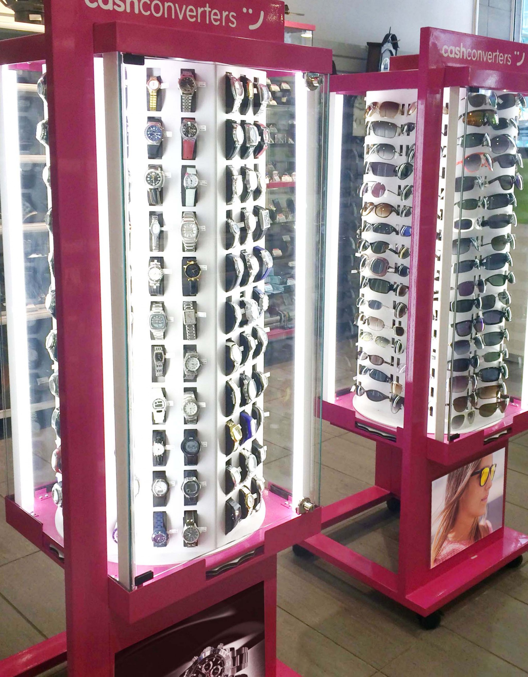 Expositor giratorio con iluminación LED para relojes y gafas. Se trata de una vitrina con cuerpo metálico pintado con pintura epoxi de color acorde a la identidad corporativa de Cash Converters. La zona de exposición de los relojes está realizada en PVC blanco.