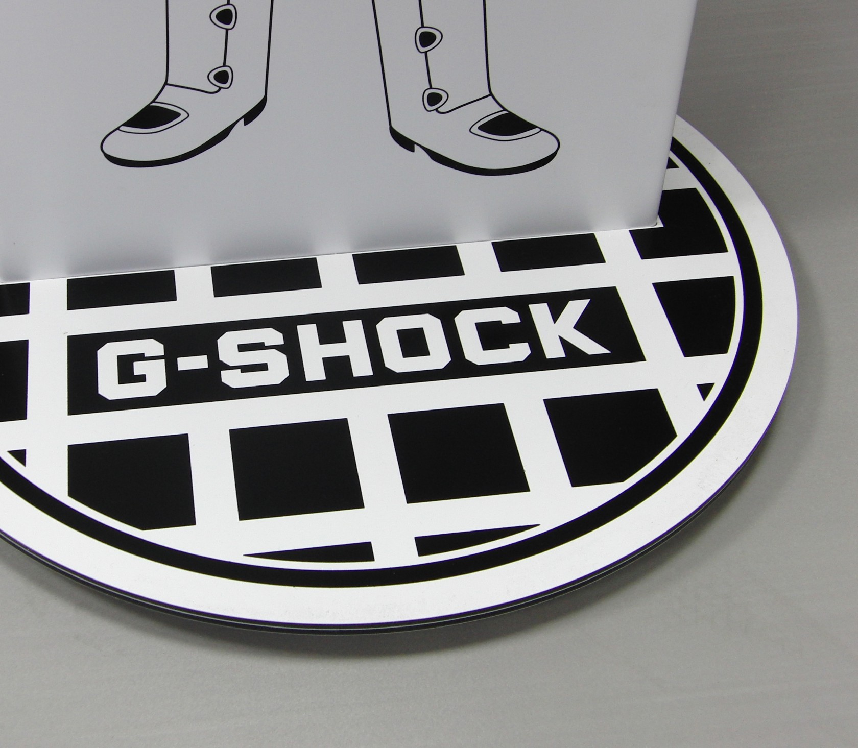 Este expositor de pie tiene muchos detalles de diseño que lo hacen muy atractivo y que están en total consonancia con la filosofía del producto que expone: relojes G-Shock. Por ejemplo en su base se ha simulado mediante serigrafía la tapa de una alcantarilla, lo que le aporta un aire urbano. Por otro lado para exponer los relojes de manera original y divertida se diseñaron manos en diferentes posiciones que posteriormente se serigrafiaron y cortaron en metacrilato.
