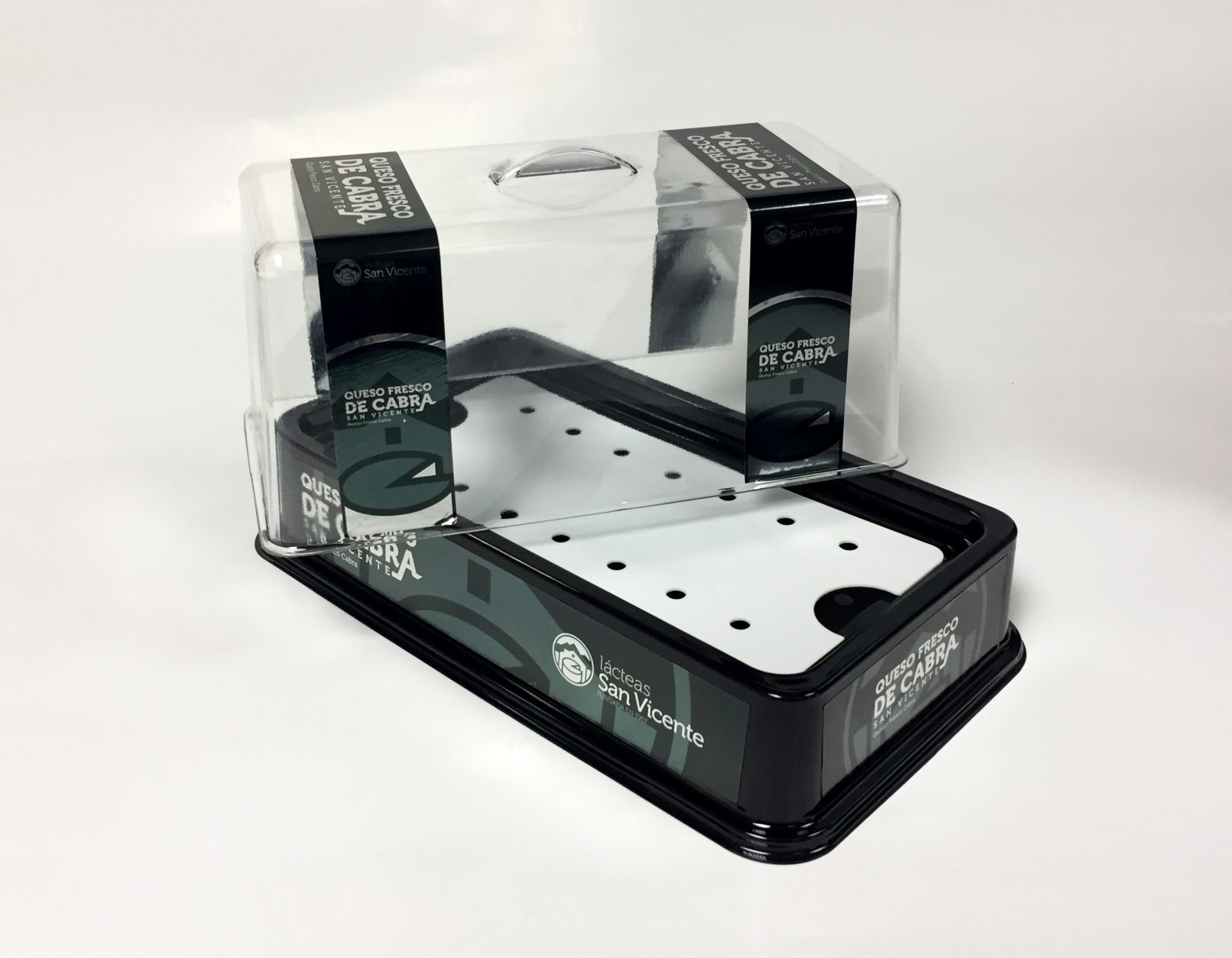 La quesera está compuesta por 3 piezas: una base de poliestireno anti-choque negro termoconformado, una urna de PETG incoloro también termoconformado y una bandeja interior de poliestireno; La bandeja consta de 2 carriles con empujadores de que facilitan el acceso al producto expuesto.