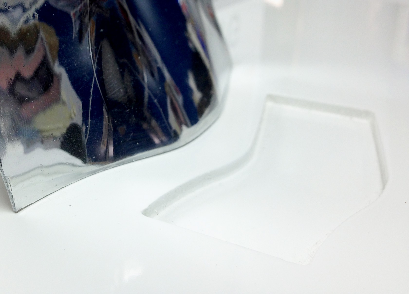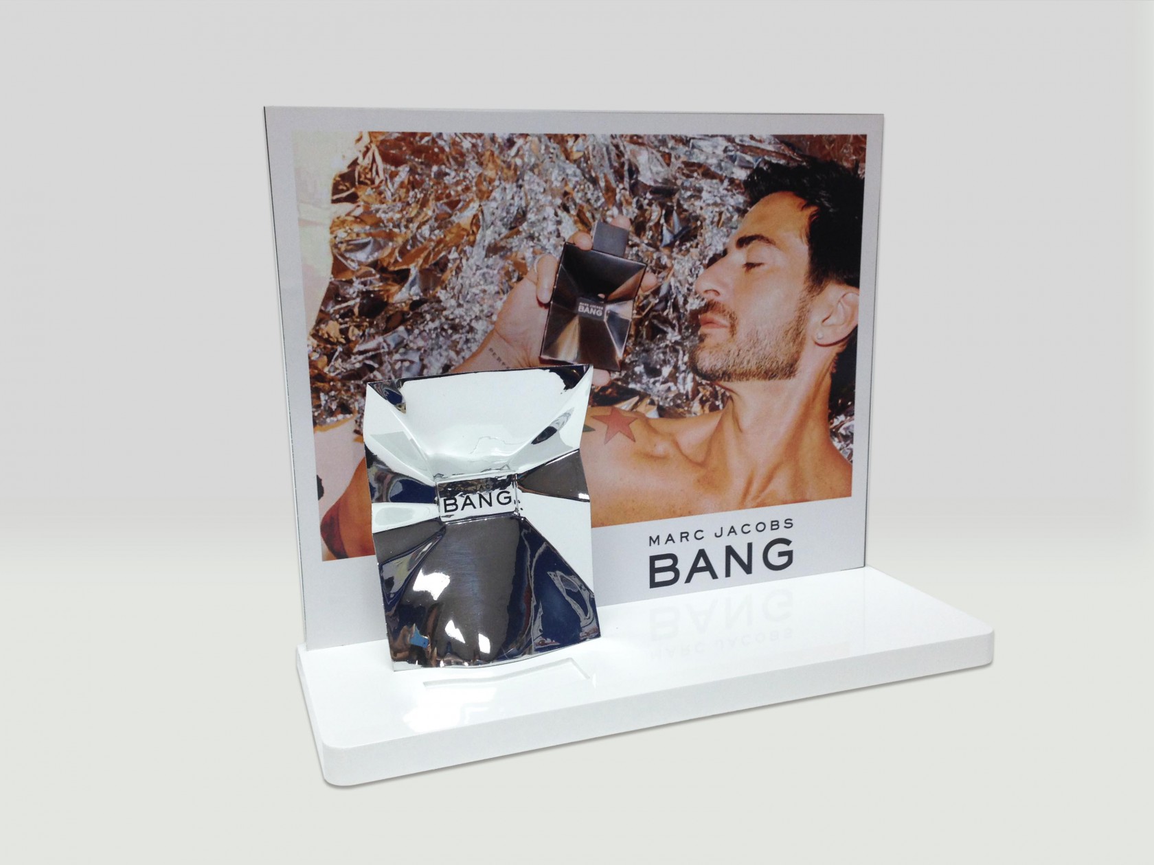 El «punto fuerte» de este glorificador es la pieza de ABS termoconformado y posteriormente cromado y tampografiado que evoca al llamtivo frasco del perfume «Bang Bang» de Marc Jacobs.